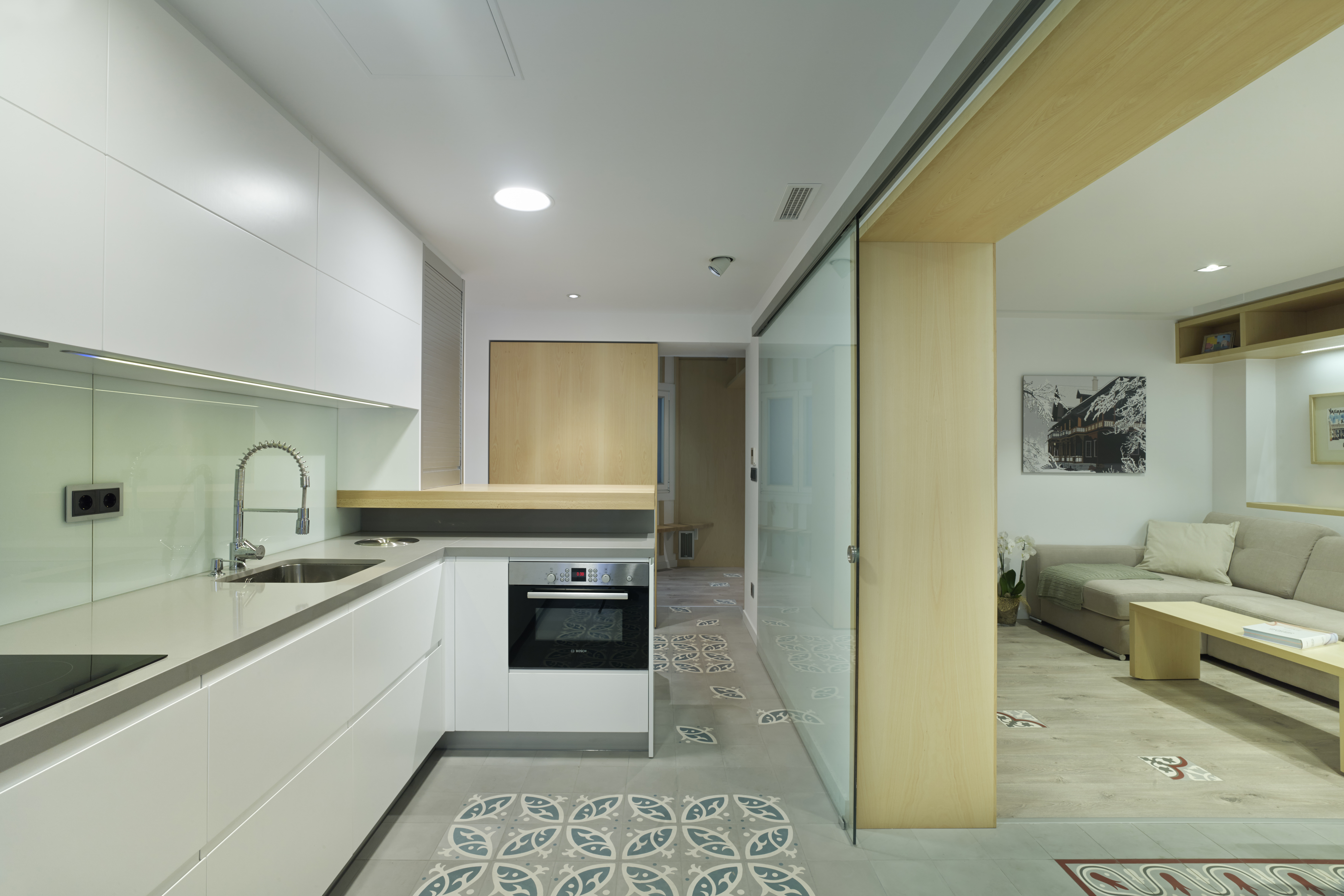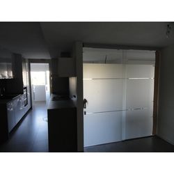 - Sistema empotrado a falso techo: montaje en dos fases para una instalación fácil. - Ausencia de rieles en el suelo para liberar la zona de paso.